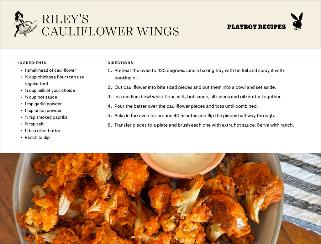 “These are super easy and spicy cauliflower wings that are a great alternative or addition to buffalo chicken wings,” Riley told PLAYBOY.