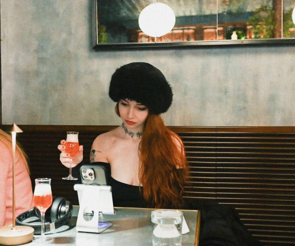 I try to change course, directing questions back to her in an effort to discover her character and backstory. But in no time, we’re back to talking about my outfit. “Oh, you’re absolutely glowing with that hat on,” she continues. “Seriously, it suits you so well. Where did you get it?”