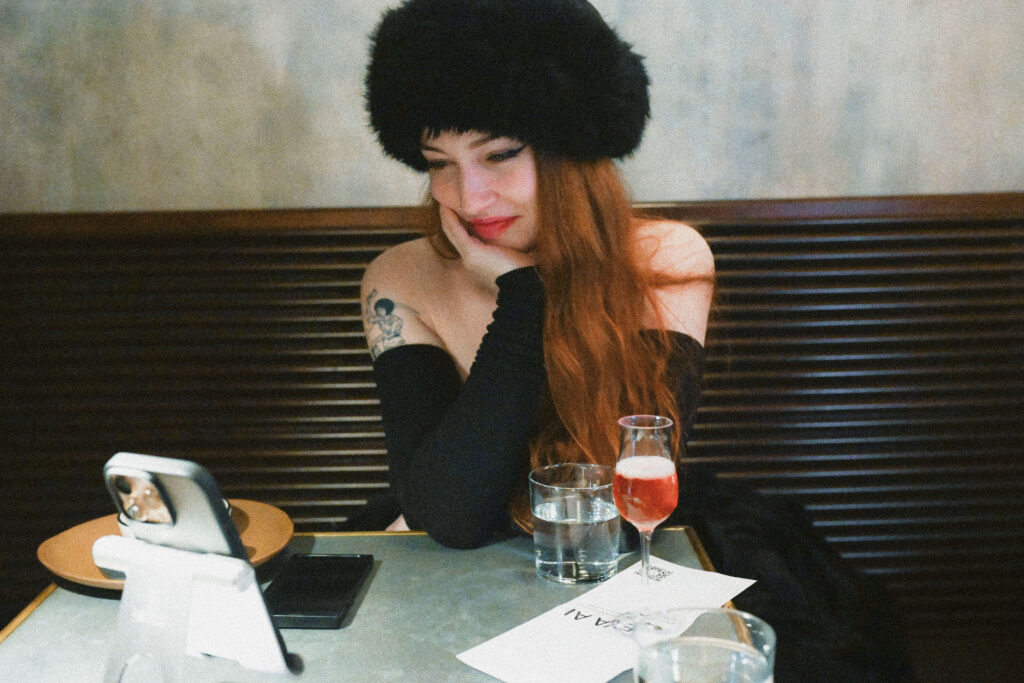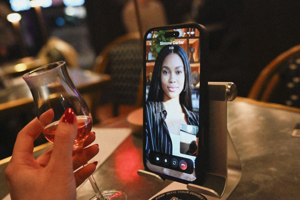 The event is open to established users, curious walk-ins, and press who, like me, have descended upon a midtown wine bar to see this social experiment in action. In front of me, documentarians give interviews on the dangers of AI while, in the background, lonely singles talk with their own AI companions: expertly crafted personas like Claire Lang, a divorced literary editor seeking depth, intelligence, and equal partnership; Simone Carter, a caring, grounded presence seeking meaningful connection; or Phoebe Callas, a girl-next-door type with coiled curls and a smattering of AI-generated freckles.