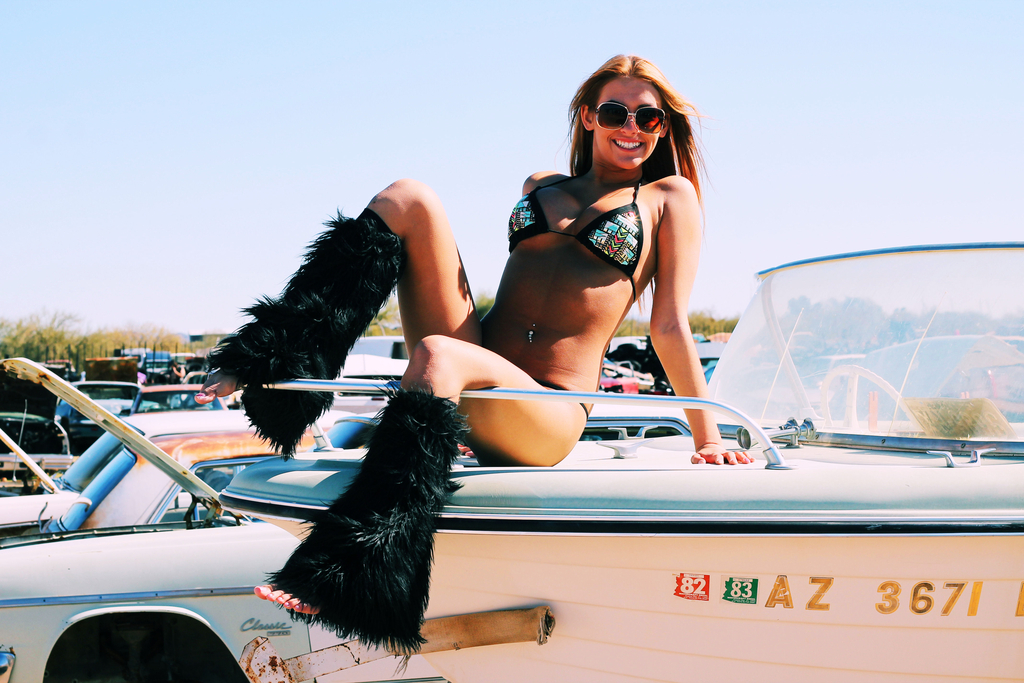 For a string of several years, the Junkyard Shootout, hosted by Arizona-based photographer James Sasser, was an open invitation to models and photographers to come together and create beautiful art amongst the urban decay. The junkyard itself is home to the rusted remains of countless wrecks, boasting their scars in the form of shattered windshields, crumpled doors, and twisted frames. It’s a graveyard turned playground, so to speak, and if your tetanus shot is up to date, there’s no shortage of interesting backgrounds to work with. A hollowed-out school bus sits atop a stack of stones, busted boats are forever landlocked, and I swear there’s an old creepy truck way in the back of the lot that looks like it was plucked straight out of Jeepers Creepers.